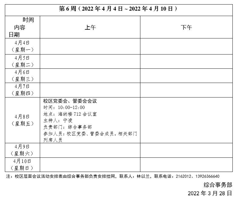 2021~2022学年第二学期第6周会议活动安排表
