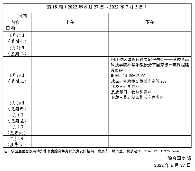 2021~2022学年第二学期第18周会议活动安排表