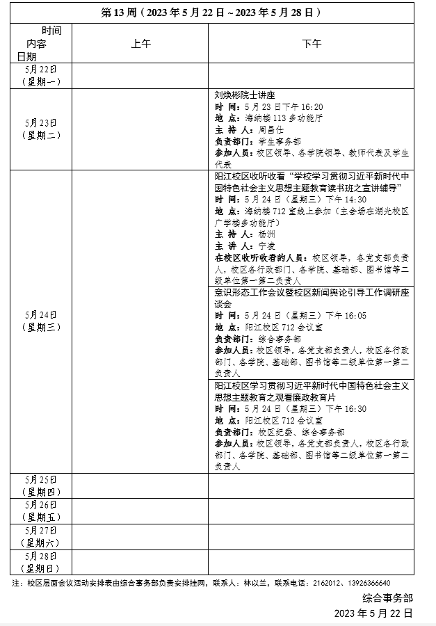2022~2023学年第二学期第12周会议活动安排表