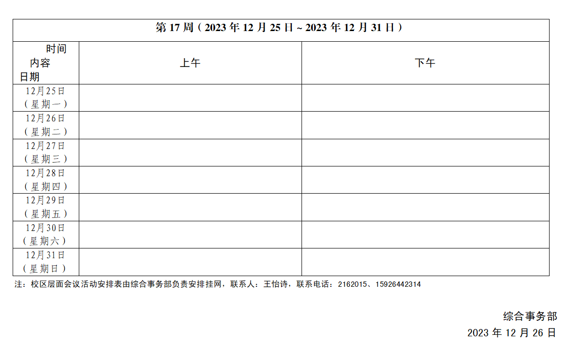 2023~2024学年第一学期第17周会议活动安排表