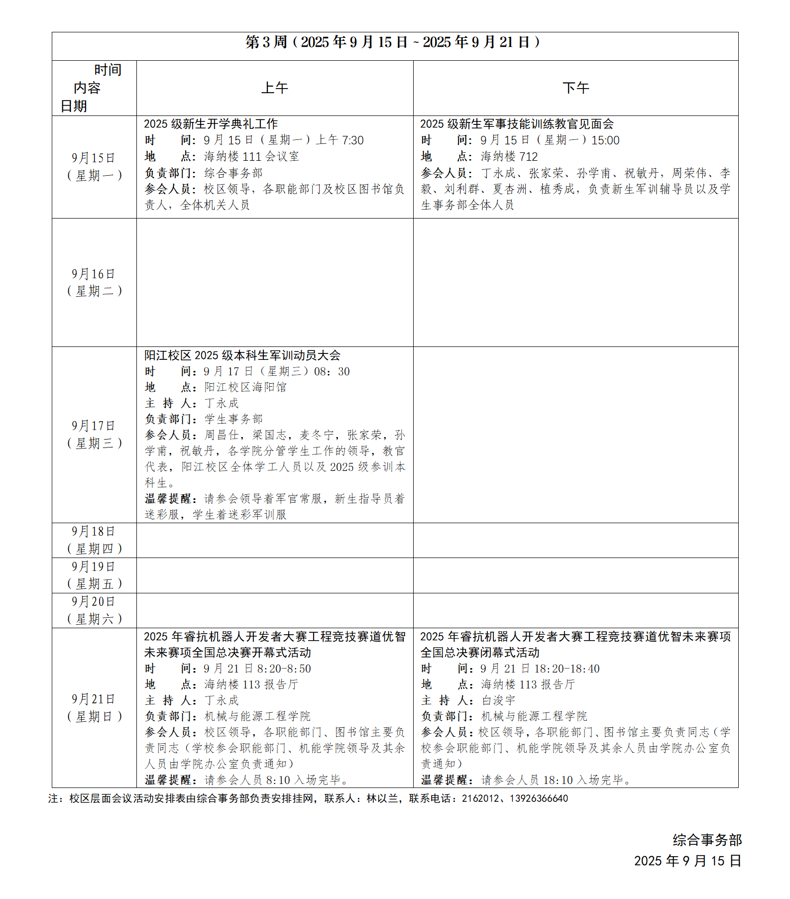 2025~2026学年第一学期第3周会议活动安排表