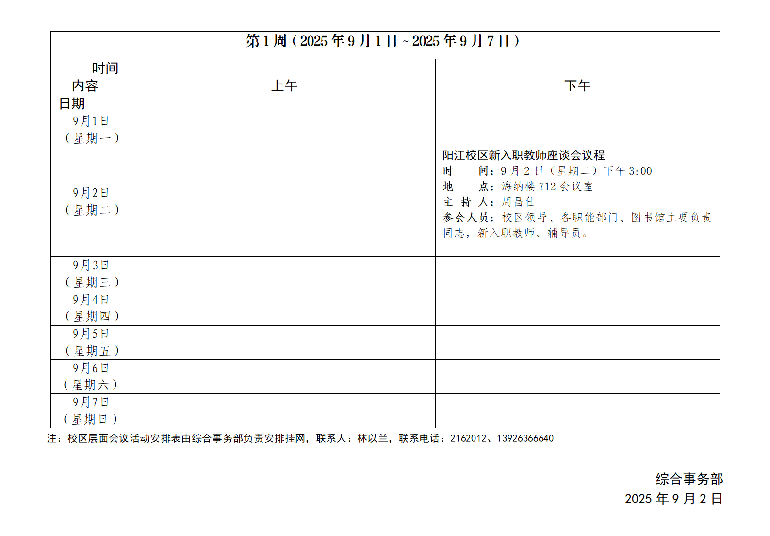 2025~2026学年第一学期第1周会议活动安排表