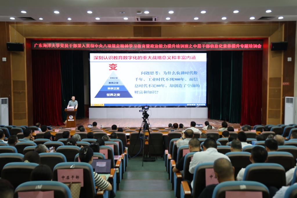 为深入贯彻落实教育数字化战略行动,提升干部队伍信息化素养,5月21日上午,学校在湖光校区广学楼多功能厅举行中层干部信息化素养提升专题培训会。武汉理工大学信息化办公室主任马斌应邀作专题报告。学校党委常委、副校长邓逢光主持会议。全校中层干部,组织部、现代教育技术中心干部及机关党委正科职干部等约300人现场参会,阳江校区同步通过线上直播收看。